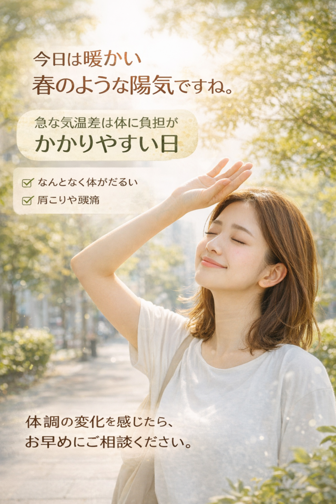今日は暖かく、春のような陽気ですね。 気温が上がると過ごしやすくなる一方で、体は急な変化にまだ慣れていません。 このような気温差がある日は 自律神経が乱れやすく、 ・なんとなく体がだるい ・頭が重い ・眠気や疲れが取れに […]