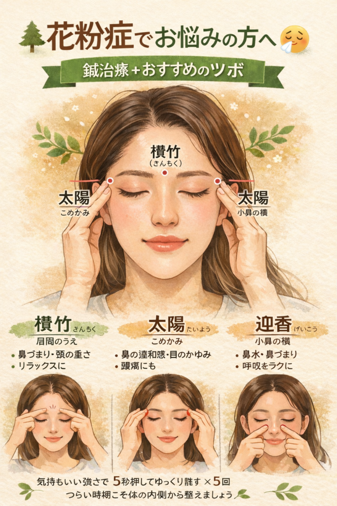 スギ花粉の時期、 くしゃみ・鼻水・鼻づまりつらいですよね。 鍼治療は 自律神経を整え、 鼻の通りや免疫バランスをサポートします。 今日はご自宅でも押せる おすすめのツボをご紹介します。 🔹 迎香(げいこう) 小鼻の横にあ […]